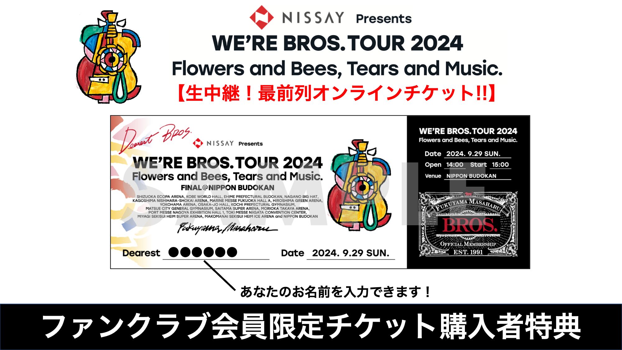 上記販売期間中に【ファンクラブ会員チケット】をご購入いただいた「BROS.」「BROS.+」「福山雅治モバイルファンクラブ」会員の方には、ご参加いただいた公演にて撮影したデジタルフォト「最前列!DIGITAL LIVE PHOTO!!」を終演後にプレゼント!!
